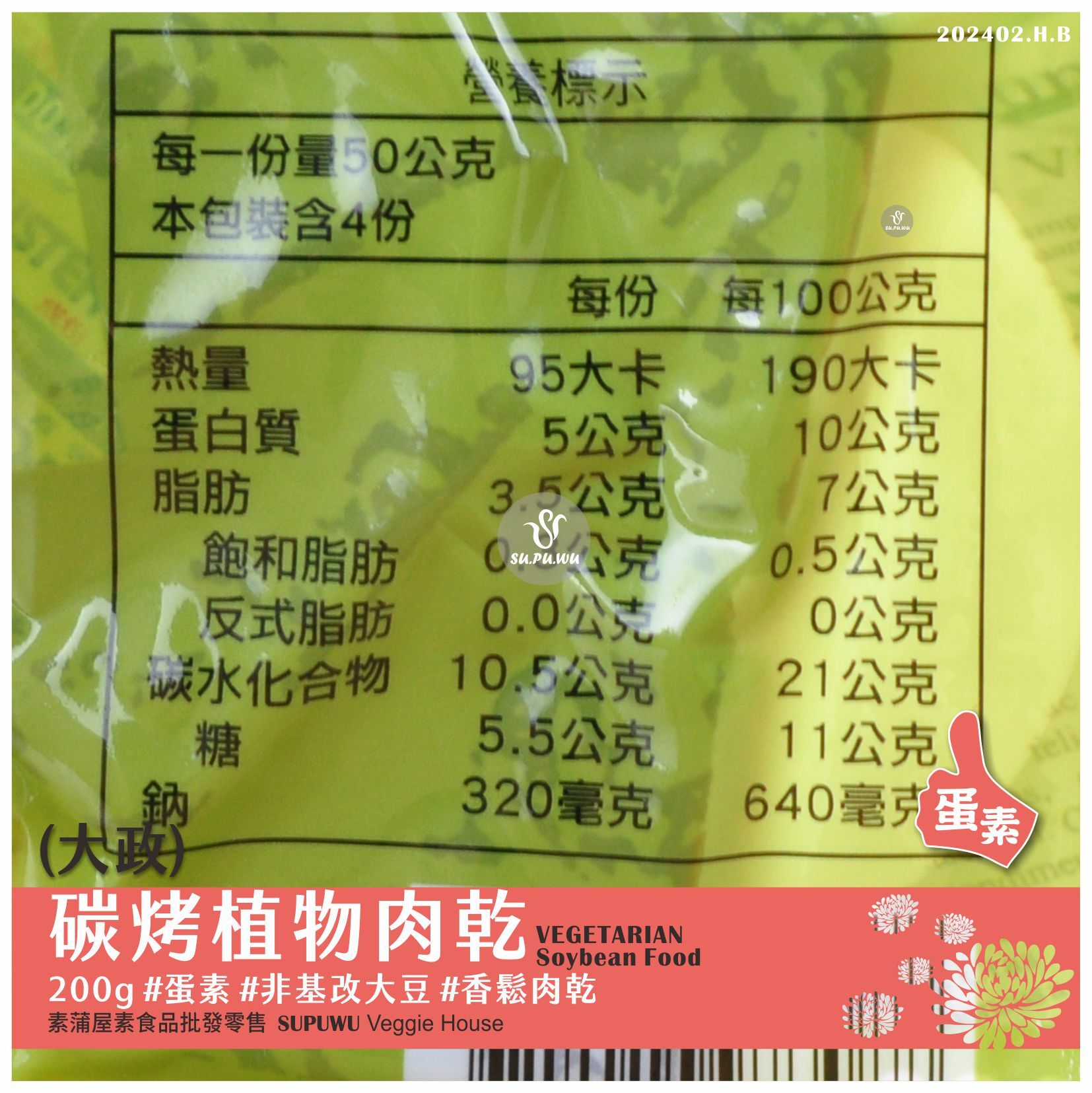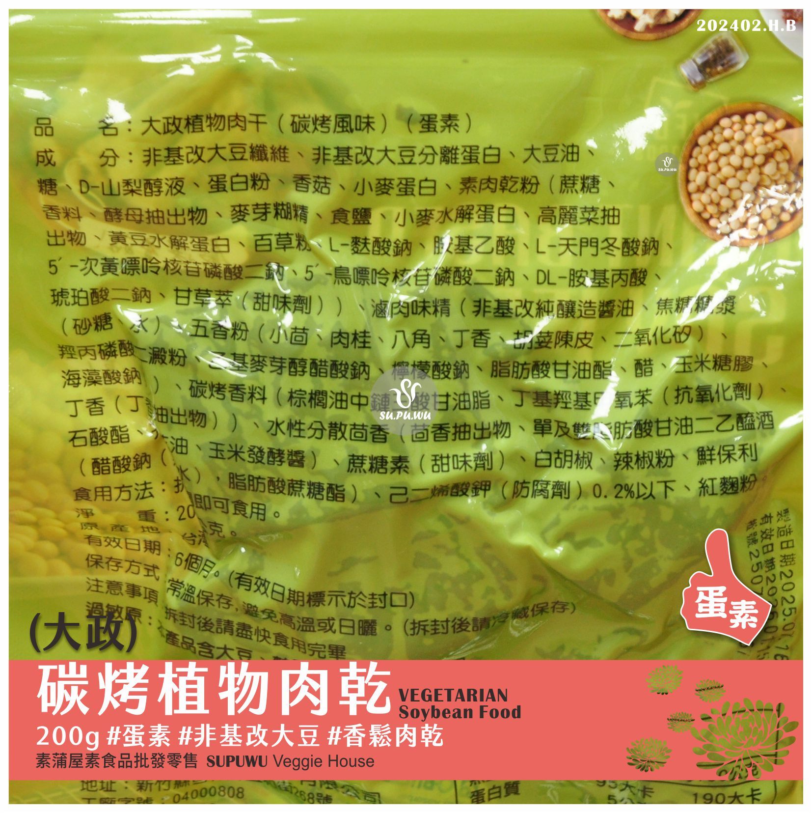 主要成分:非基改大豆纖維、蛋白粉、糖、香菇、素肉乾粉