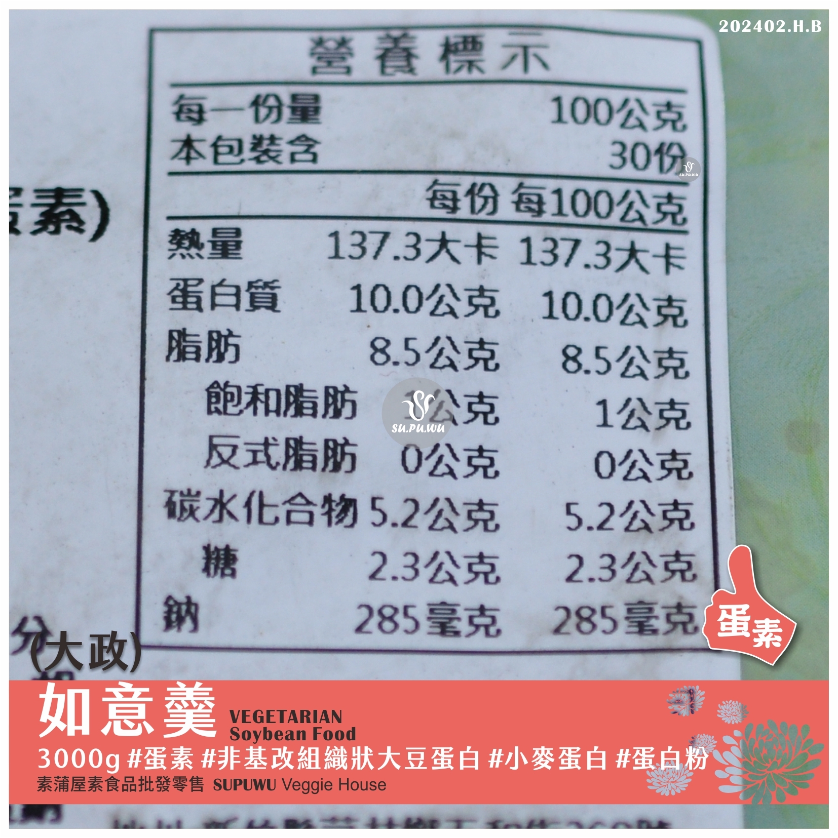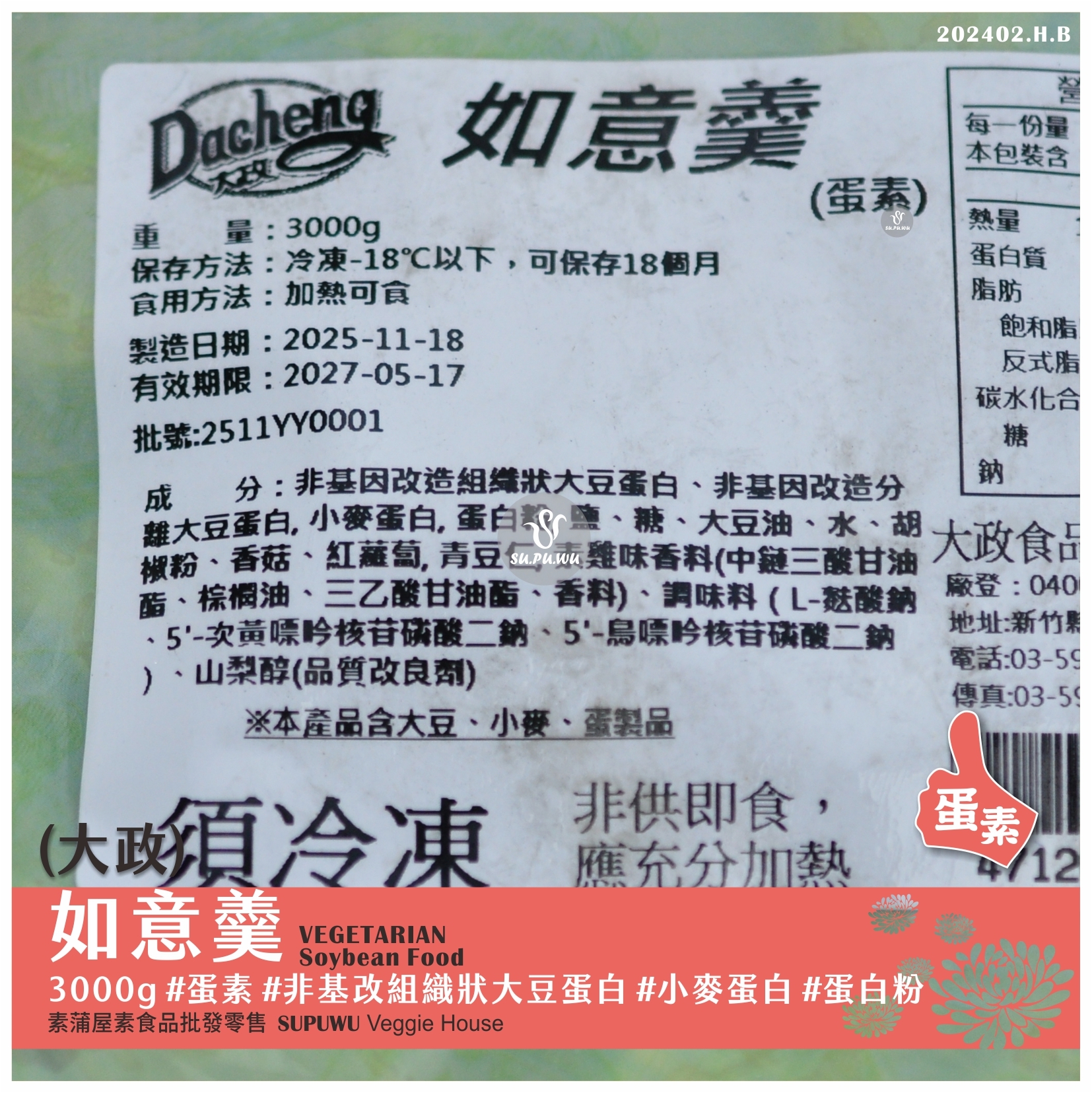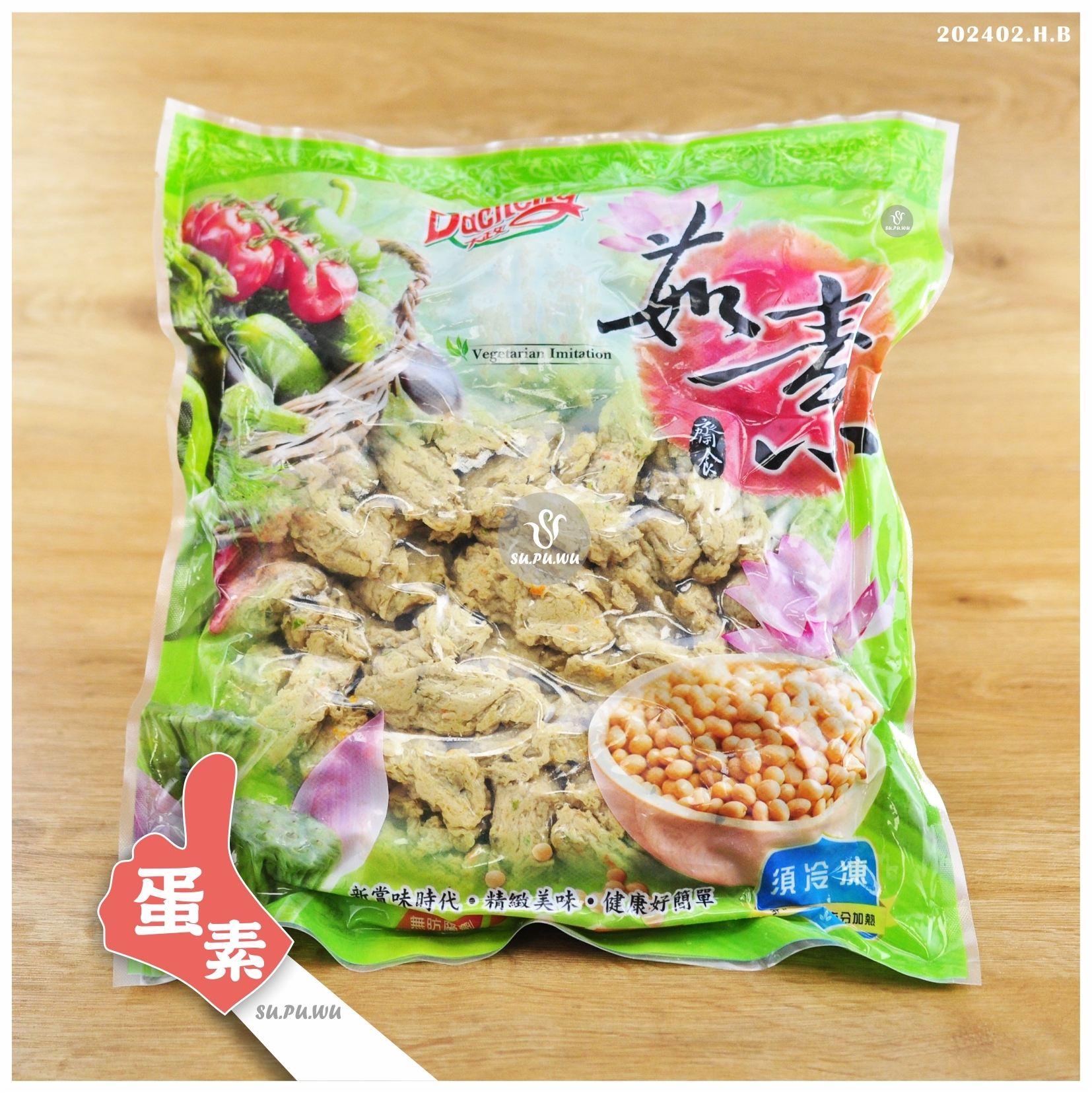 主要成分:非基因改造大豆蛋白、蛋白粉、胡椒粉、香菇、紅蘿蔔、青豆仁