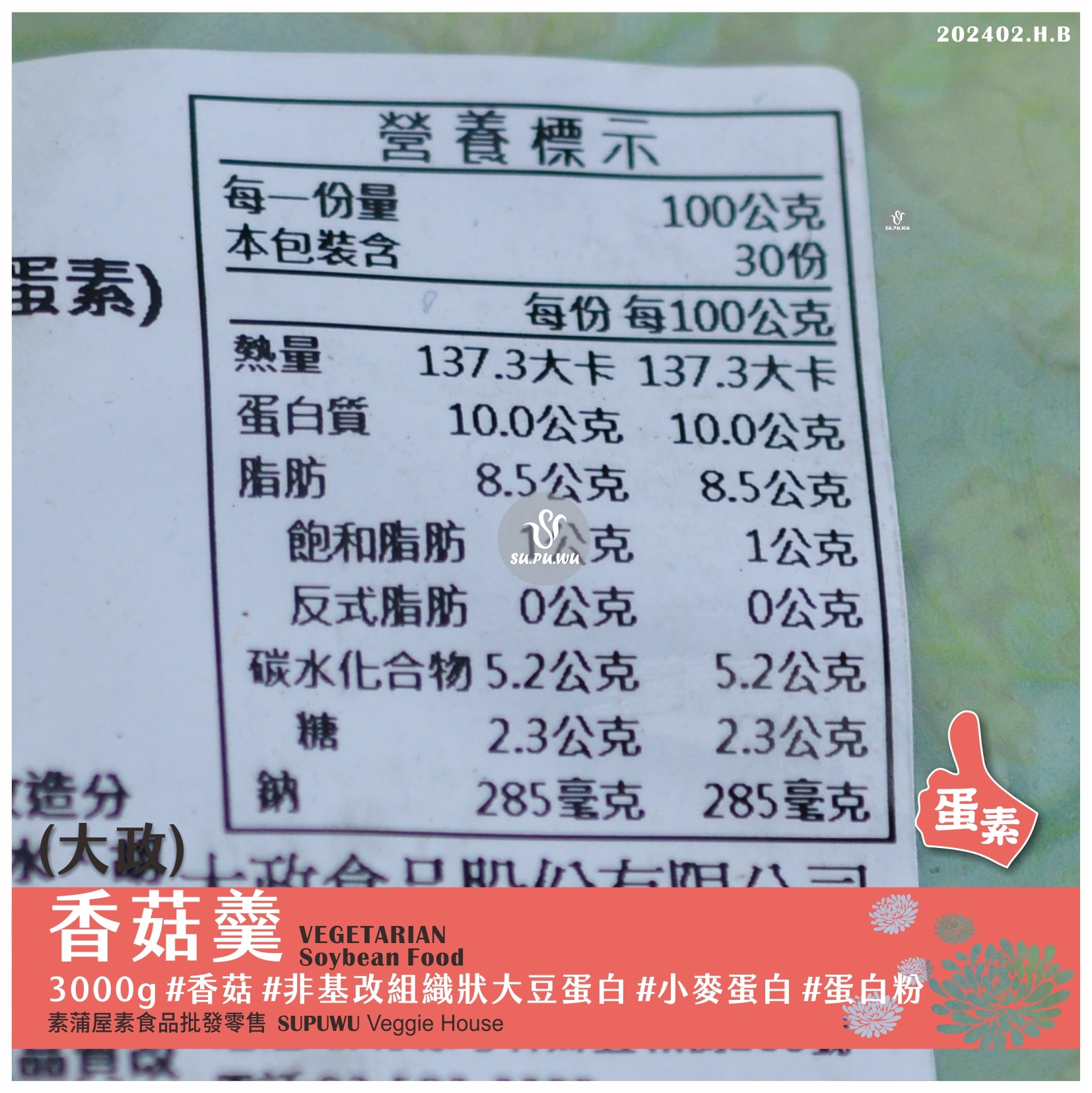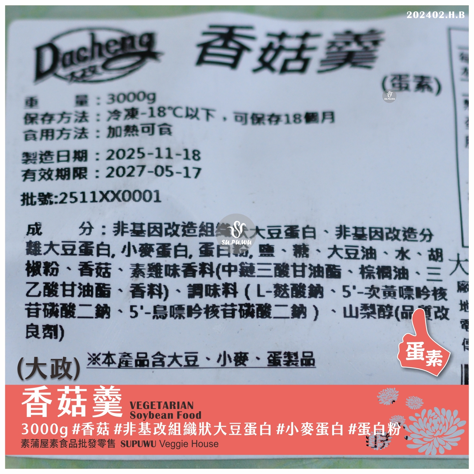 主要成分:非基因改造大豆蛋白、蛋白粉、胡椒粉、香菇