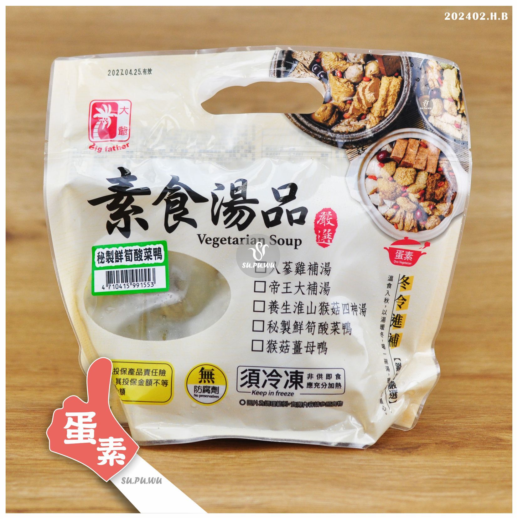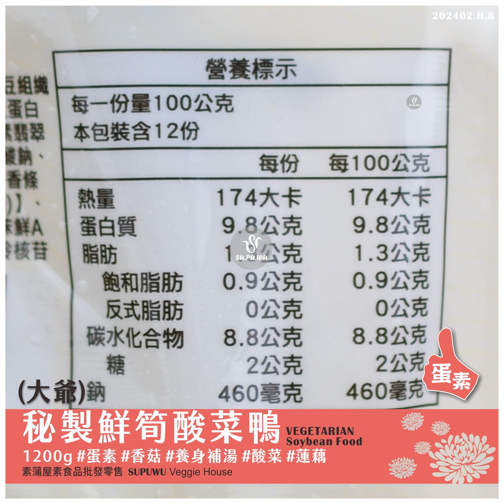 主要成分:水、酸菜、素鴨肉塊、素燉肉、大豆蛋白、素翡翠丸、麥香條、蓮藕、白胡椒粉