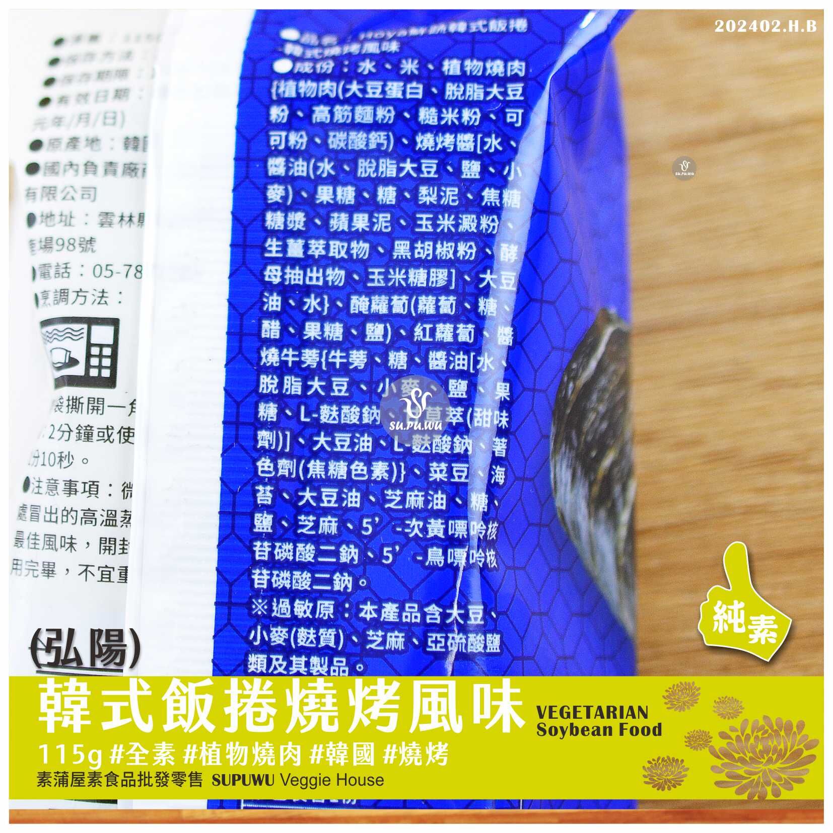 主要成分:水、米、植物燒肉、燒烤醬、醃蘿蔔、紅蘿蔔、醬燒牛蒡、海苔