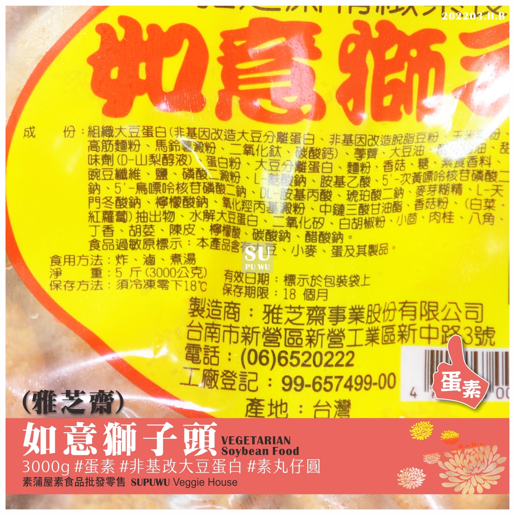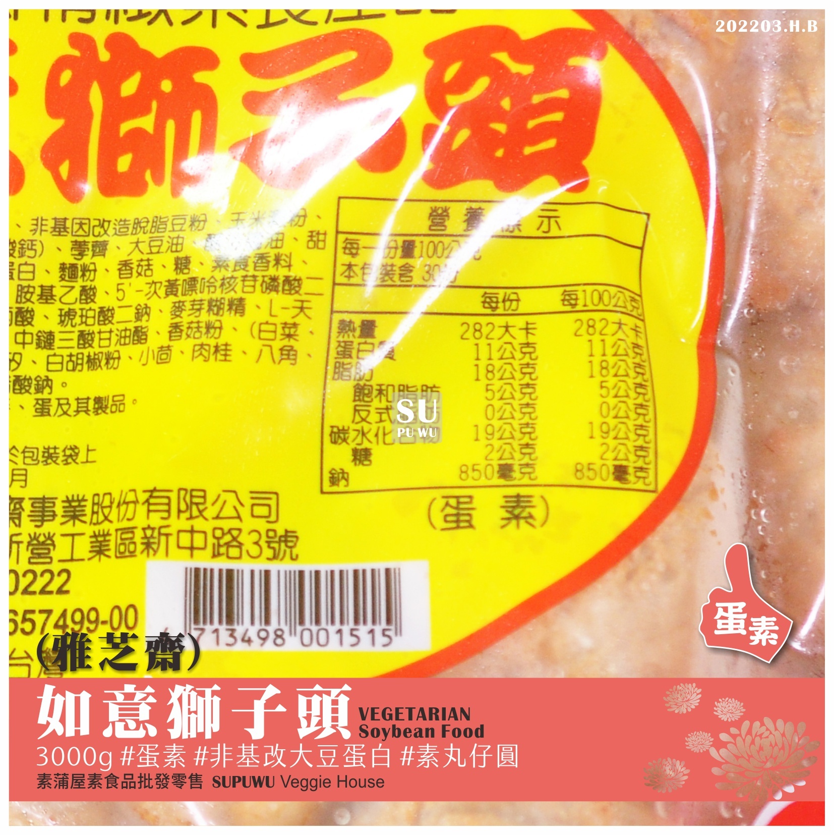 主要成分:大豆蛋白、澱粉、荸薺、蛋白粉、香菇